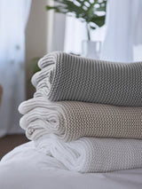 Ellos is a soft cotton knit constructed from thick, plush yarns. This simple, modern blanket is the perfect lounging accessory.