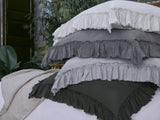 The Tat Linen sham is finished with a tattered ruffle border around all sides and an envelope closure.